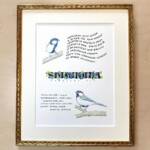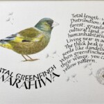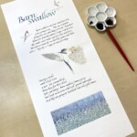 また、行間には詩の中に出てくる景色を水彩画で描いています。一番下には金箔をスクラッチして穀物の模様を入れました。青い鳥は貼り付けています。