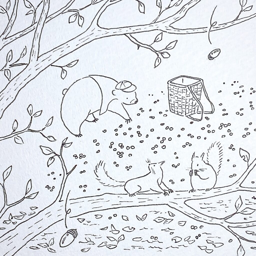 クマとリスの大きさの差が激しいのを解消するためと、なんとなくリスの手前から見下ろす感じの構図がいいなと思ったのでこんな絵になりました。